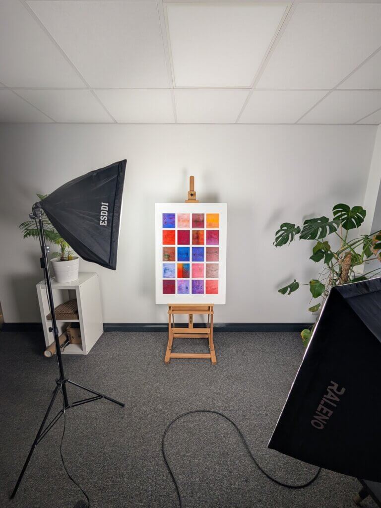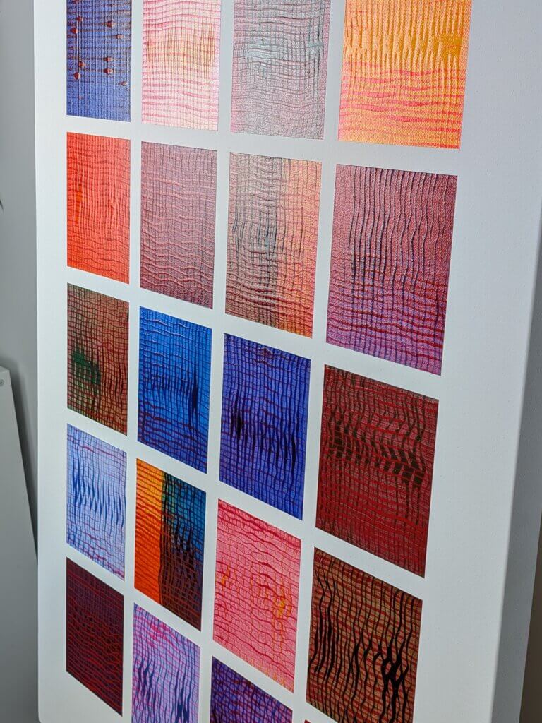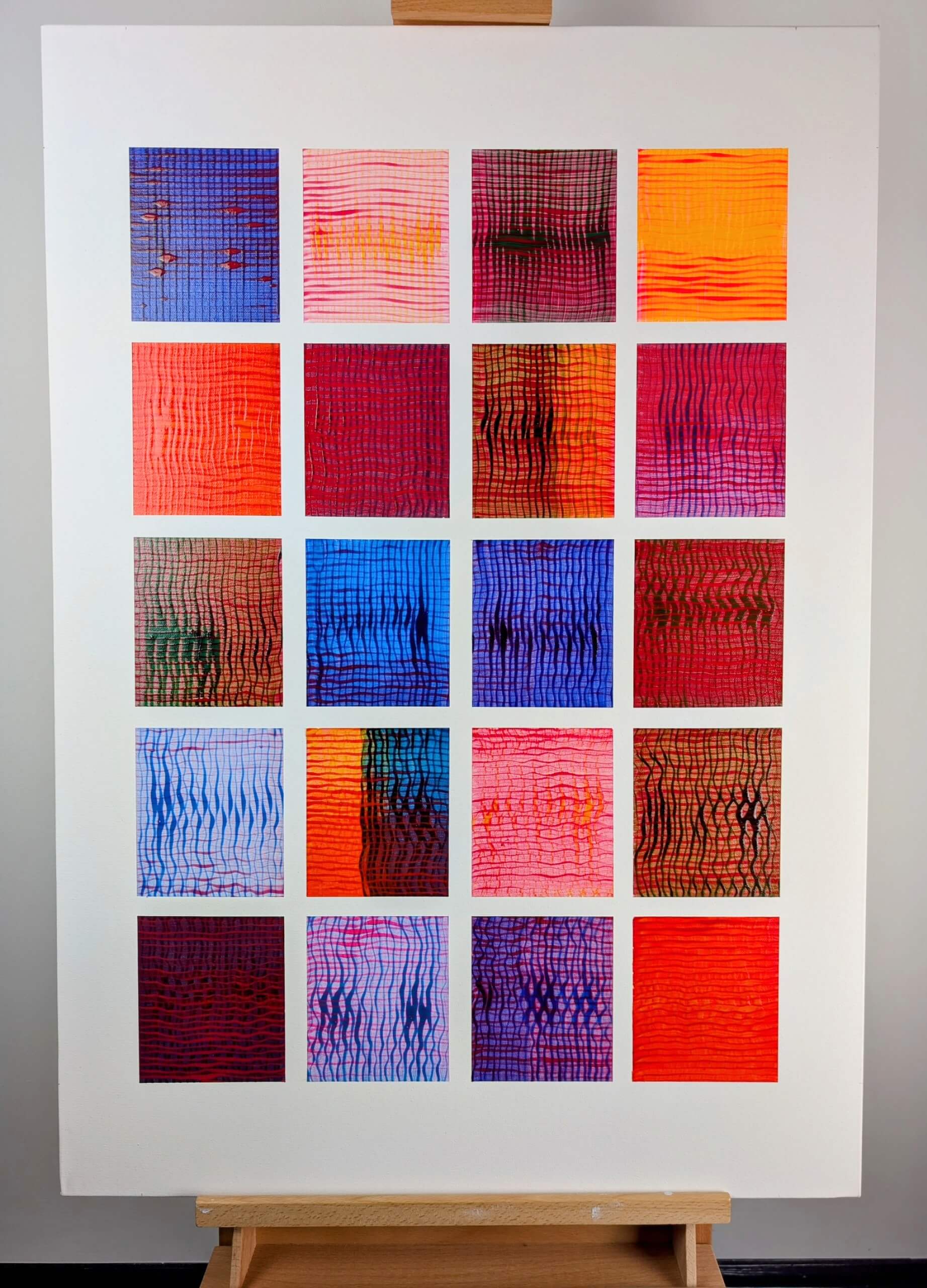 Repetition and perfection are broken up with the unpredictability of fluid dynamics and pigment layering.